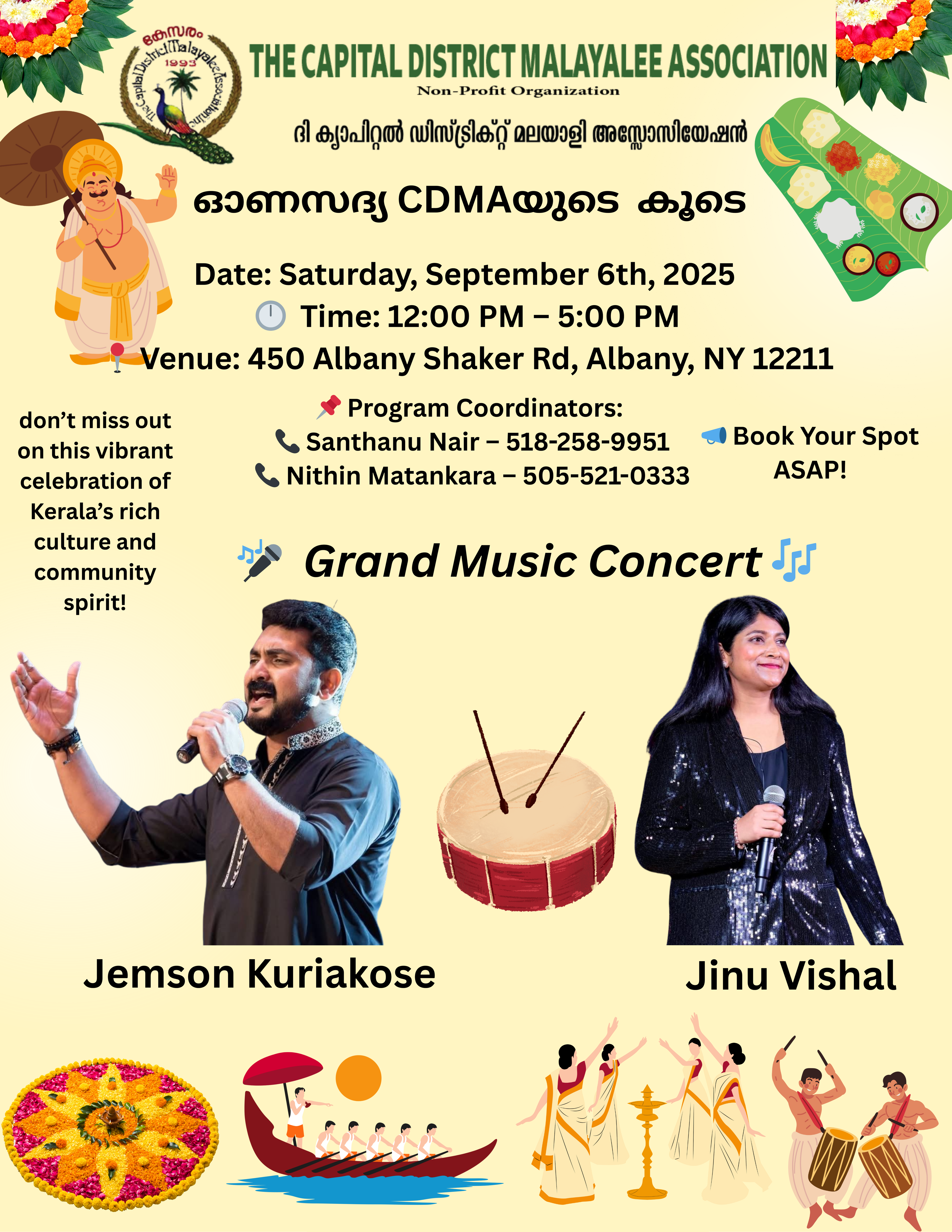 Onam-2025 Promotional admission fee will end on 9/3/2025 at 10:00 PM. After that admission fee will be: Family $100, Single $35 & Guest $20. Saturday, September 6, 202512:00 Noon – 5:00 PM 450 Albany Shaker Rd, Albany, NY 12211 Onam Registration RSVP List Search Entries: FirstLastEmailAre you a current member of CDMA?Member Admission Fee No entries match your request. FirstLastEmailAre you a current member of CDMA?Member Admission Fee
